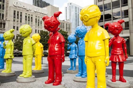 A collection of brightly colored figures has taken up residence at Pioneer Court Plaza, formerly the site of the Marilyn Monroe figure. They’re part of Chicago Ideas Week and created by Chicago artist Hebru Brantley, who is the Chicago Ideas Week 2013 Artist in Residence. Read about them here. They’ll be in place at least until October 20.