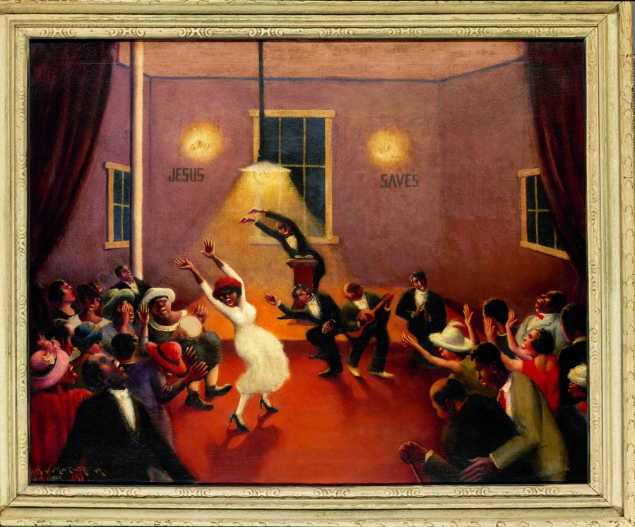 Painting “Tongues (Holy Rollers)” by Archibald J. Motley, Jr., 1929. Oil on canvas. View of a church meeting in rural Arkansas.