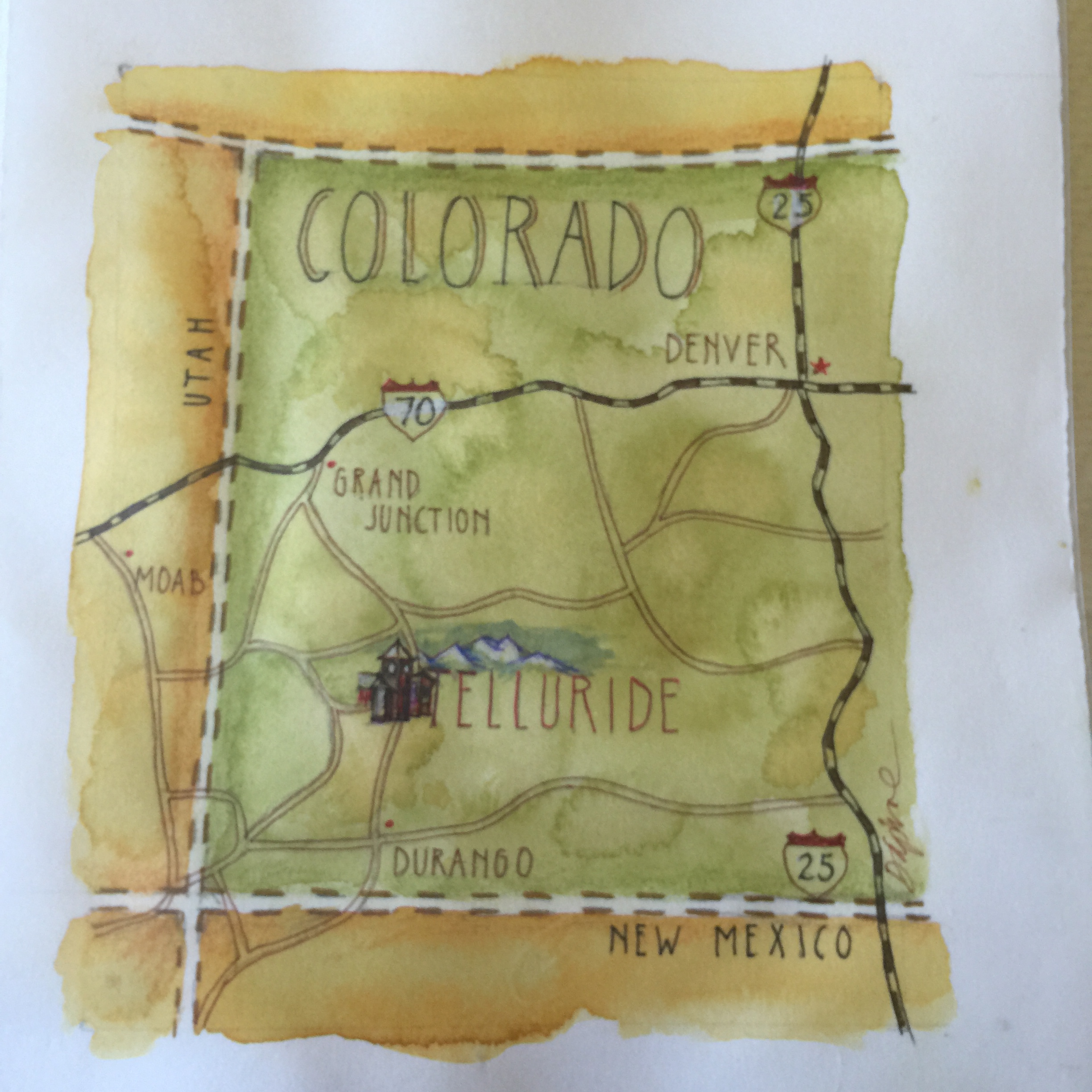 MT-ColoMapOne day we visited Daphne Gillam, an artist who creates beautiful illustrative maps, at her home in the Shields River Valley. I was eager to see how she creates these maps and expected to see her sitting in front of a giant LCD screen. Instead, she is working on a piece of linen-finish paper taped to her desk top, painting with a well-used set of water colors and brushes, both medium and fine. You can see a gallery of her maps on her website, where she also describes the process she goes through when creating a map for a client, which is often a publisher.