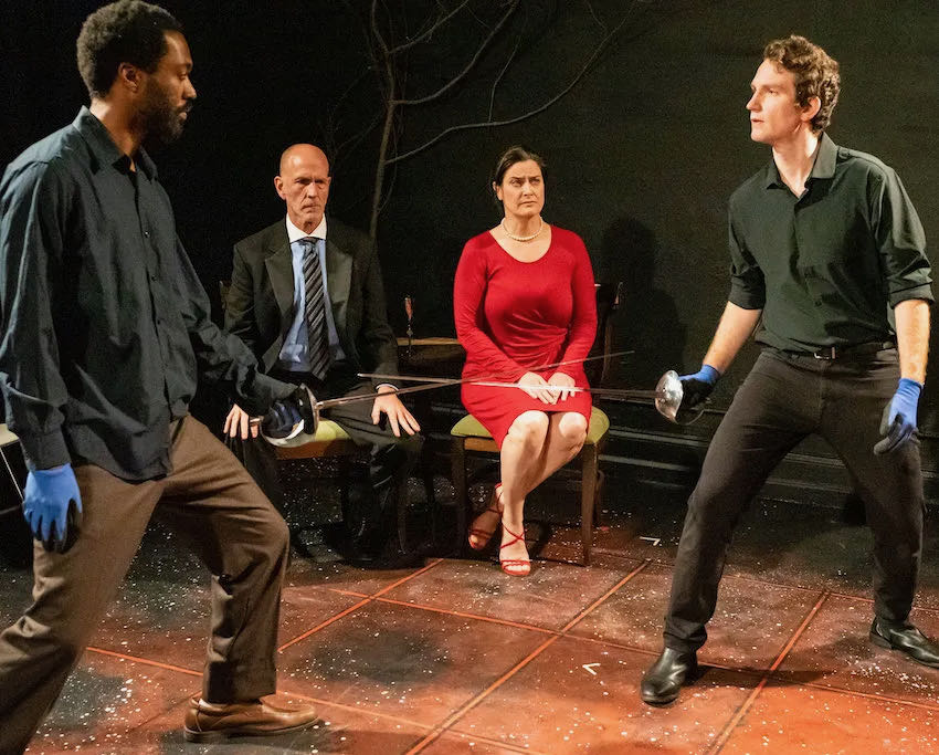 At Invictus Theatre, the fight begins. Laertes (Michael Lewis) vs. Hamlet (Charles Askenaizer), as Claudius (Joseph Beal) and Gertrude (Diane Sintich) watch. Photo by Brian McConkey.
