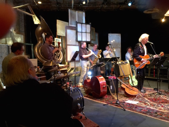 Bucky Halker, a singer-songwriter and PhD in labor history from the University of Minnesota, just released his new album, Anywhere But Utah: The Songs of Joe Hill, at an album release party at the Filament Theatre in the Six Corners neighborhood. Bucky played with the Big Shoulders Brass Band, featuring two saxophones, trumpet, tuba, trombone and drums. John Abbey sat in on upright bass on several numbers. Bucky and the band played two sets, including “Scissor Bill,” and concluded with a procession around the theater.