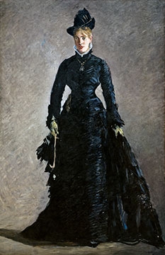 Impressionism, Fashion and Modernity at the Art Institute of Chicago is an elegant tour of the fashions and social customs of the late 19th century as displayed in impressionist paintings from the collections of the Art Institute, the Metropolitan Museum and Musée d’Orsay in Paris, the three museums that organized the exhibit. The exhibit is highlighted with gowns similar to those worn in the paintings displayed and properly accessorized with footwear, gloves and chapeaus. The exhibit takes us from the elaborate, fussy, long-trained gowns that required corsets and cautious walking to day gowns and walking ensembles that freed the 19th-century woman from some of the strictures of corset, bustle and fabric. (Photo courtesy Art Institute of Chicago.)