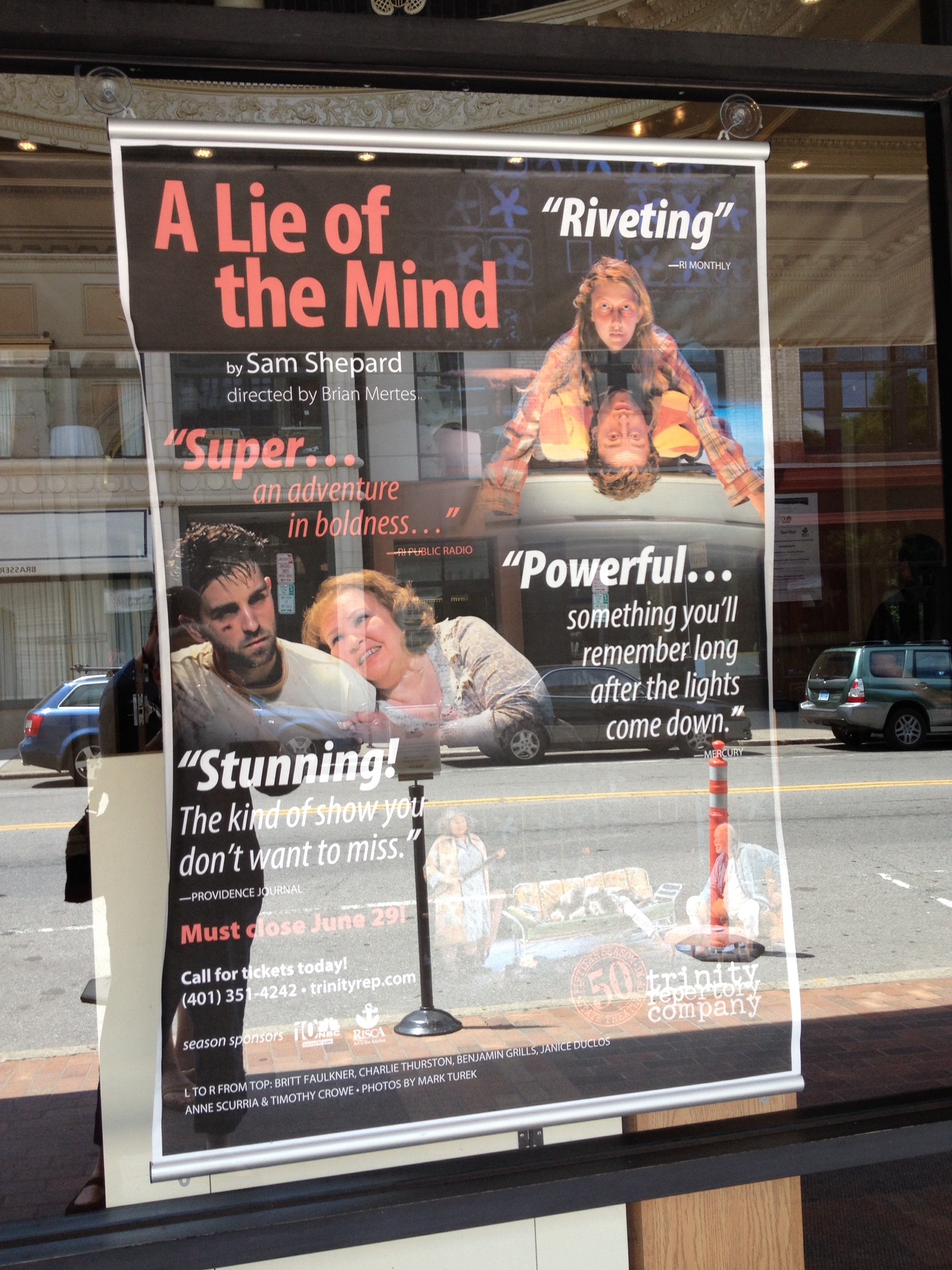 At Trinity Repertory Company in Providence, we saw an excellent production of Sam Shepard’s A Lie of the Mind. This veteran repertory company presented a gripping version of this Shepard play. It was my favorite performance of the two weeks.