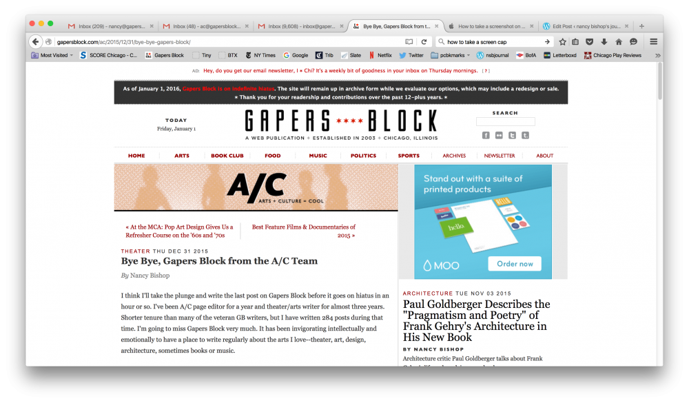 Posted: January 3, 2016 Filed under: Digital life, Movies, Music, Theater | Tags: Chicago Architecture Biennial, Gapers Block, Third Coast Review Leave a commentThe last year had many exciting and interesting moments for me, but the last month has been challenging. I spent most of it mourning about and planning how to recover from the demise of Gapers Block, the website for which I’ve written for almost three years. The site is now “on hiatus.” Andrew Huff, the editor and publisher of the 12-year-old website, posted a letter to readers explaining the change. And this is how the site looks now.