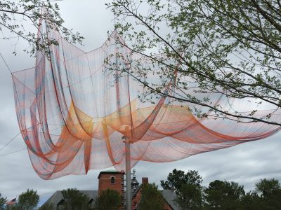 There’s a new piece of public art in a new downtown city park. It’s called “Where We Met” by Janet Echelman. It’s made of net and wire and is meant to honor the local textile industry and its workers and the networks of roads and rails that supported the industry for the many years it thrived.
