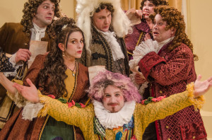 The scene is 17th century Paris and involves the competition at court between the playwright Elomire (an anagram for Moliere) and a verbose newcomer actor/playwright named Valere. The script is written in rhyming couplets and the cast knows how to deliver the lines, thanks to superb direction by Kay Martinovich. Kevin Cox as Valere is simply outstanding. His electrifying act-one monologue is one of the treats of this theater season.